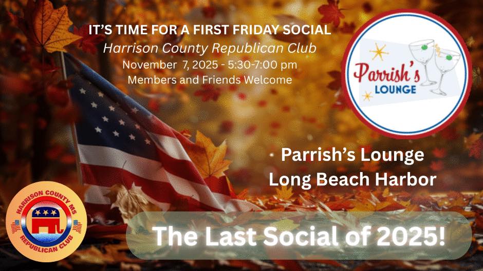 The Harrison County Republican Club holds monthly meetings on the 3rd Wednesday of each month at the Great Southern Club (top floor of Hancock Bank in downtown Gulfport).